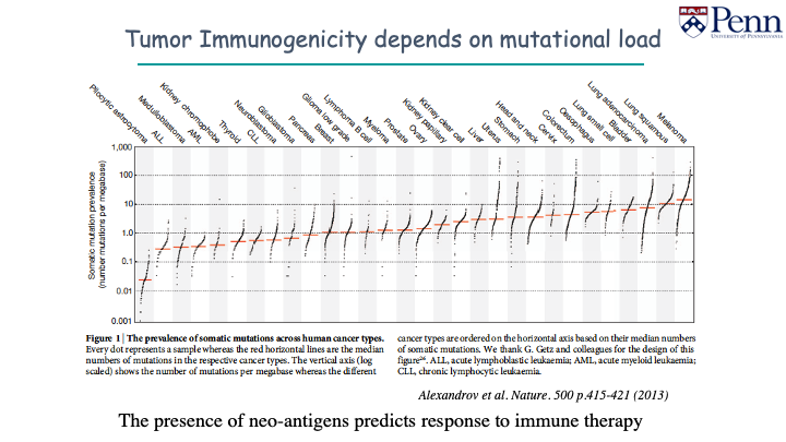 Melanoma, pulmonary carcinoma have lots of somatic mutations. Childhood cancers have low somatic mutations, and will look a lot less immunogenic. There are less mutations for the immune system to recognize, and more difficult to target with immunotherapy.